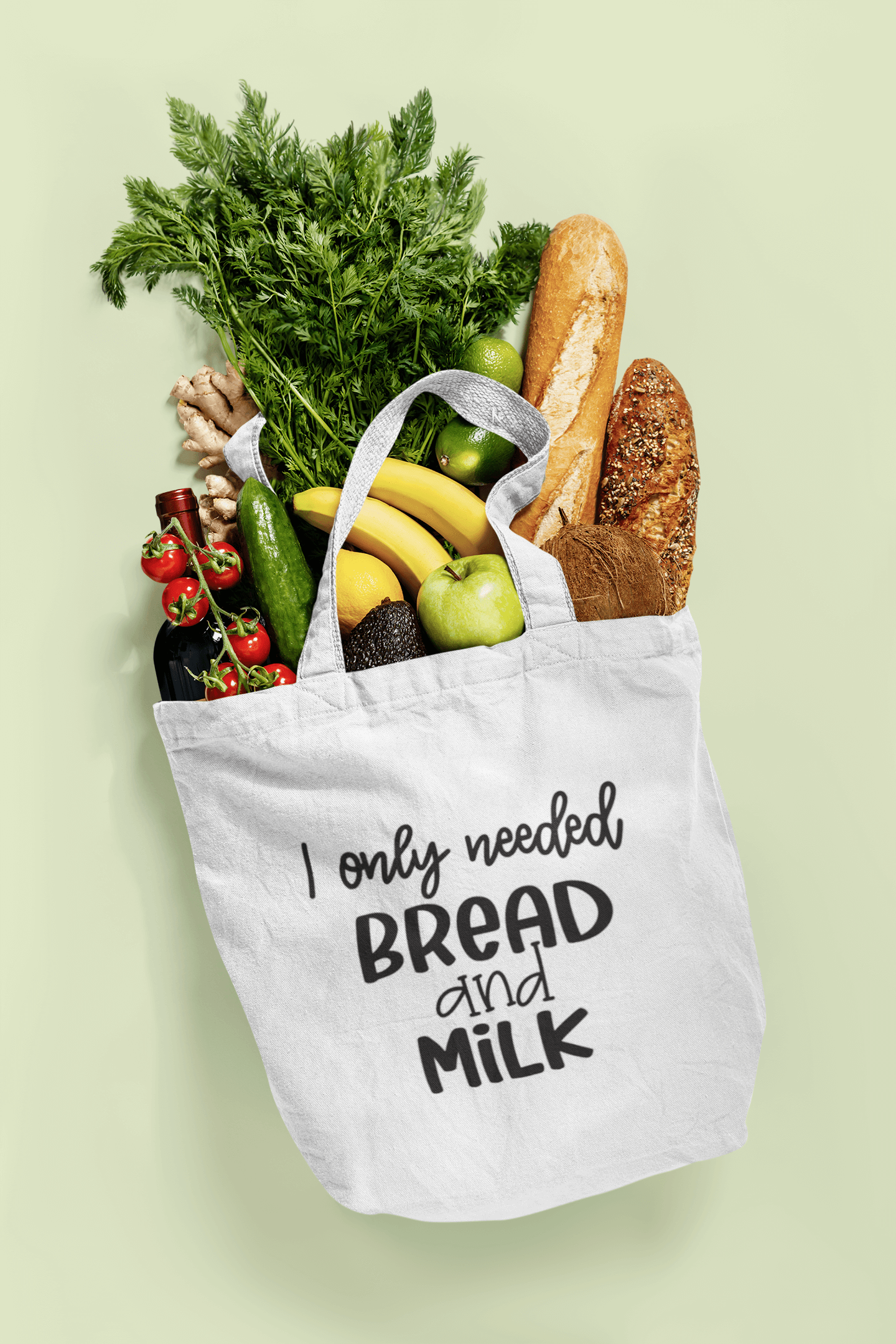 Introducing our versatile reusable tote bag, meticulously crafted from resilient fabric to withstand daily wear and tear. It’s spacious interior and sturdy handles make it comfortable to carry, while adorned with the witty phrase ‘I only needed BREAD and MILK,’ this bag adds a touch of humor to your shopping trips. Made from high-quality canvas, this tote bag is durable and can carry all your essentials with ease. Perfect for carrying groceries, daily essentials, and more. . Show off your eco-friendly and chic style with this premium canvas tote bag.
