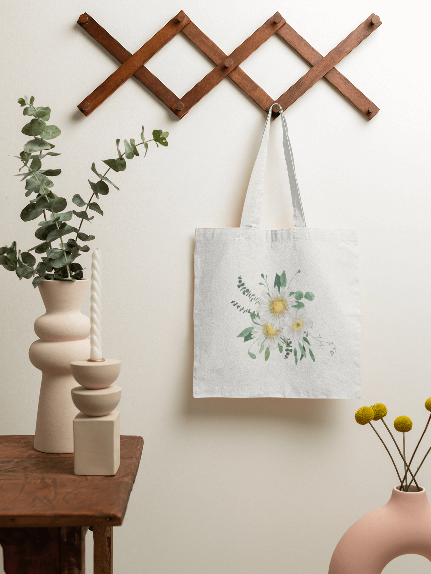Introducing our elegant Floral Canvas Tote Bag, adorned with a stunning white floral design and lush green leaves. This chic tote is perfect for carrying all your daily essentials with style and grace. Crafted from high-quality, durable canvas, it features spacious compartments to keep your belongings organized. Whether you’re heading to the market, beach, or a casual outing, this versatile bag will complement any outfit. It offers ample space without being bulky. Available in a classic cream color that enhances its floral motif, it’s a must-have accessory for any fashion-forward individual.