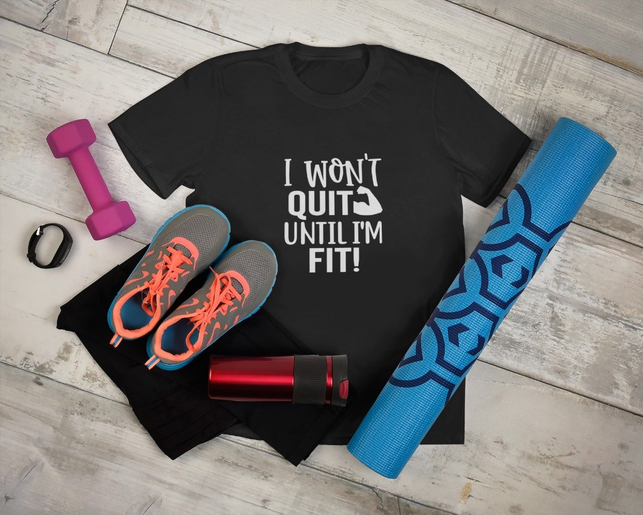 Get motivated with our black regular t-shirt featuring the inspiring slogan “I won’t quit until I am fit”. This t-shirt is perfect for your activewear, sportswear, or gym wear needs. Whether you’re hitting the gym or going for a run, this comfortable and stylish t-shirt will keep you motivated and looking great. Made with high-quality materials, it’s designed to withstand even the toughest workouts. Don’t let anything hold you back from reaching your fitness goals – wear this t-shirt as a reminder to keep pushing forward and never give up. Get yours today and stay focused on becoming the best version of yourself.
