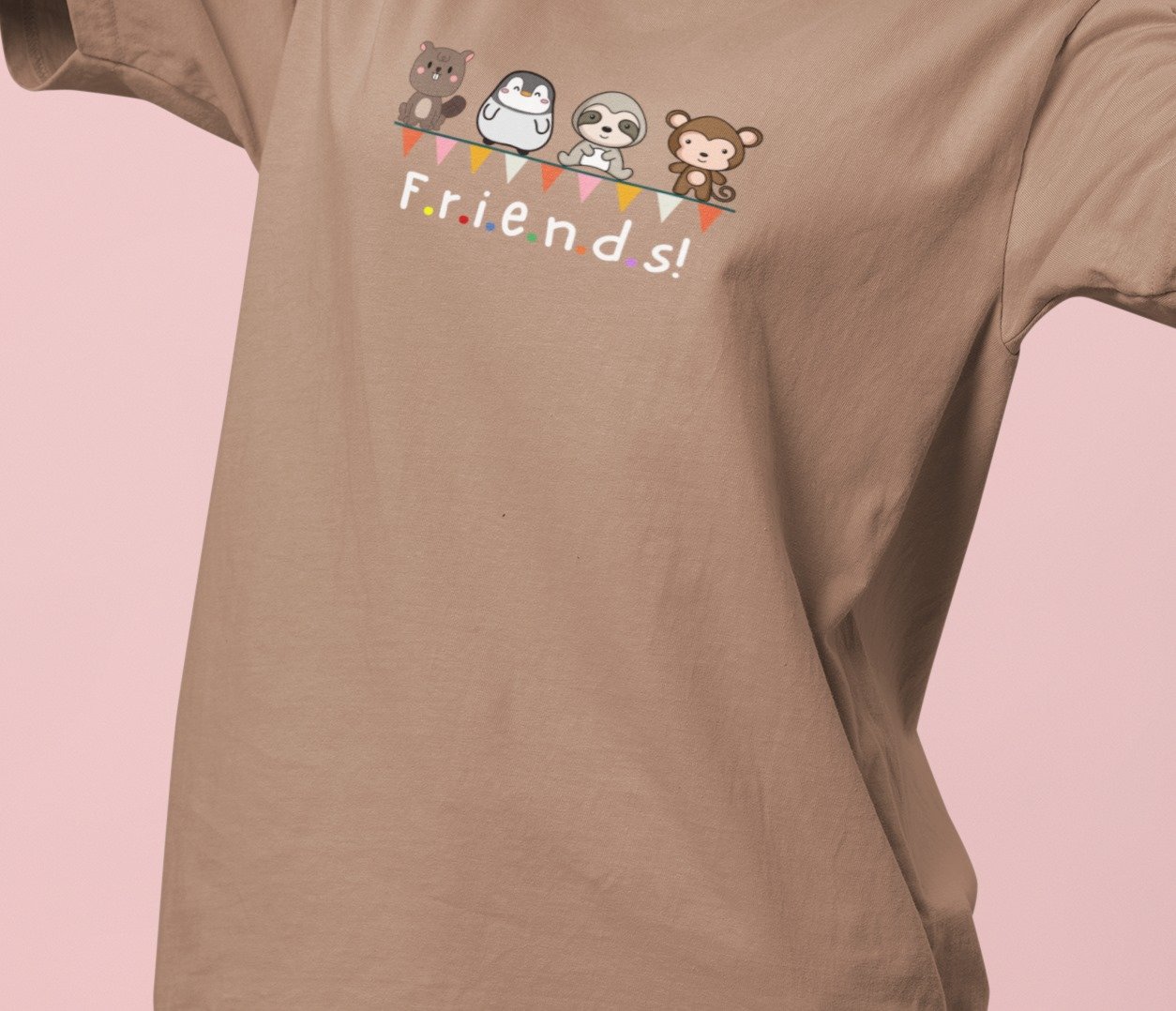 Discover our endearing ‘Cute Friends T-Shirt,’ designed to bring smiles and warmth to your casual wardrobe. Featuring charming animal characters with the cheerful word ‘Friends!’ beneath them, this t-shirt is perfect for any relaxed occasion. Crafted from ultra-soft, premium fabric, it promises unbeatable comfort and durability. Available in a variety of sizes and colors, there’s a perfect fit for everyone. Make every day a little brighter with this delightful t-shirt.