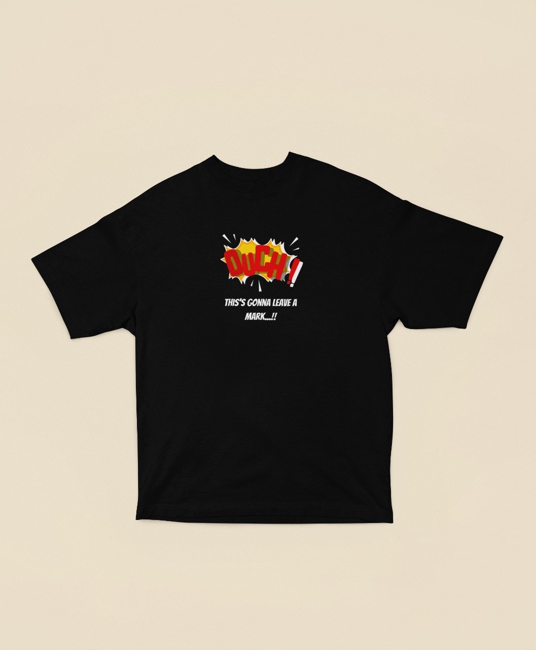 The oversized black t-shirt is a fun and stylish addition to any wardrobe. With a colorful and humorous print that says “OUCH! This’s gonna leave a mark”, it adds a playful touch to any outfit. The loose fit and soft fabric make it comfortable to wear all day long, while the bold print adds a pop of personality. Whether you’re lounging at home or heading out with friends, this t-shirt is sure to make a statement and bring a smile to everyone’s face. Pair it with jeans and sneakers for a casual and cool look, or dress it up with a skirt and boots for a more edgy vibe. With its unique design and relaxed style, this t-shirt is a must-have for anyone who loves to have fun with fashion.