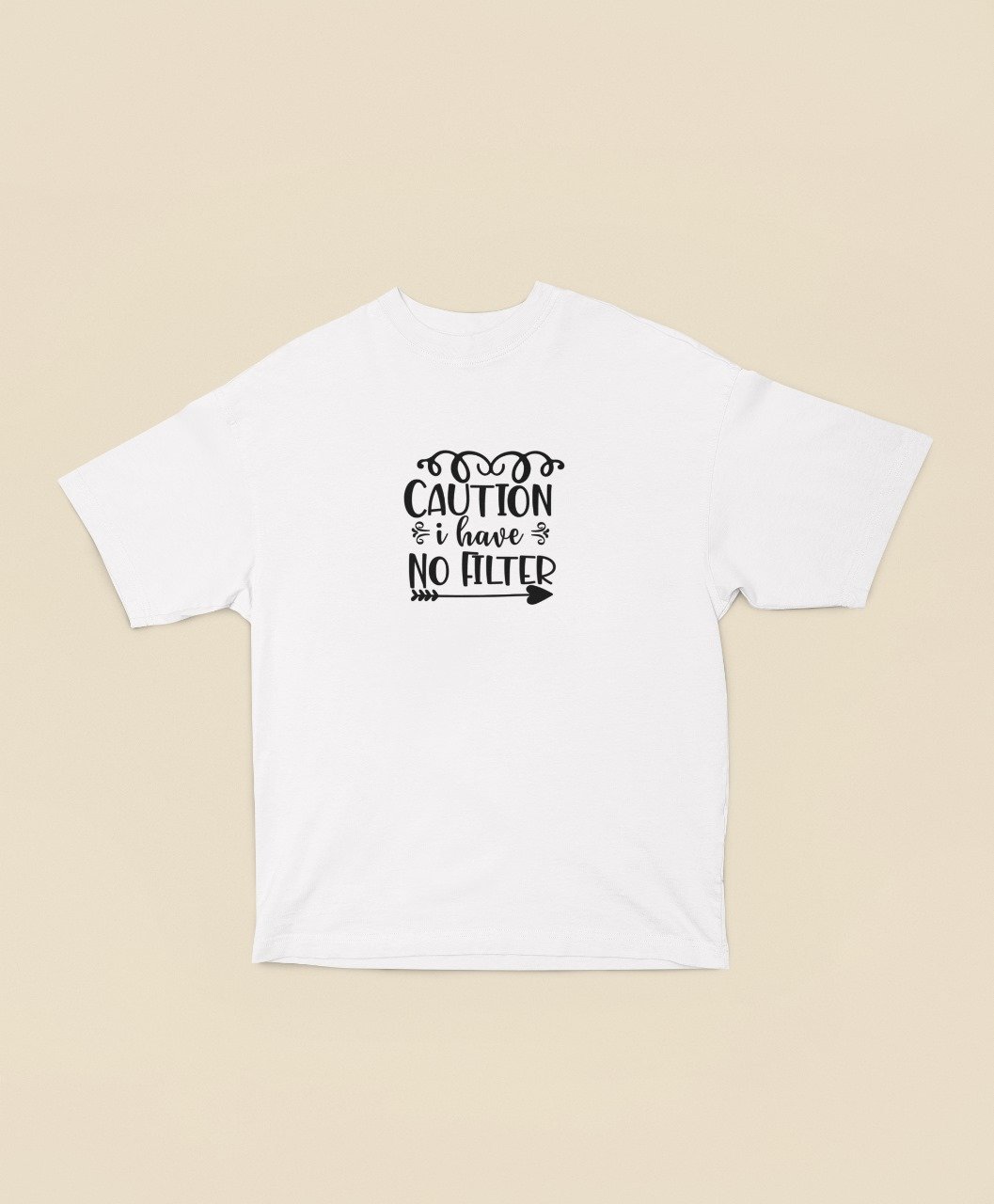 Elevate your casual wardrobe with our Graphic T-Shirt, featuring a bold and humorous design that reads ‘Caution I have no filter’. This white T-shirt is perfect for adding a touch of fun to your everyday look. Made from high-quality, breathable fabric, it ensures comfort while making a statement. Available in various sizes to fit everyone, this T-shirt is a must-have for those who love to express their personality through their attire. Ideal for casual outings, social gatherings, or just lounging around, it’s your go-to for effortless style and a good laugh.