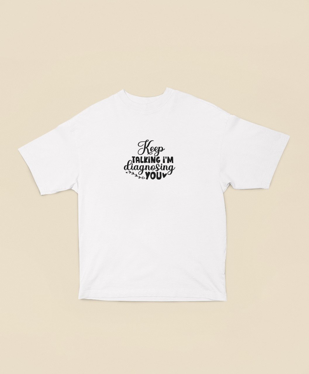 Elevate your wardrobe with our oversized white t-shirt for ladies features a bold design print that states “keep talking I’m diagnosing you.” It’s a playful and eye-catching statement piece that adds a touch of humor and attitude to any outfit. The soft fabric and loose fit makes it comfortable for everyday wear, and the white color makes it easy to style with a variety of bottoms. Whether you’re hanging out with friends or just running errands, this t-shirt is sure to make a statement and spark some conversations. It’s a fun and trendy addition to any wardrobe, perfect for those who love to make a bold fashion statement.